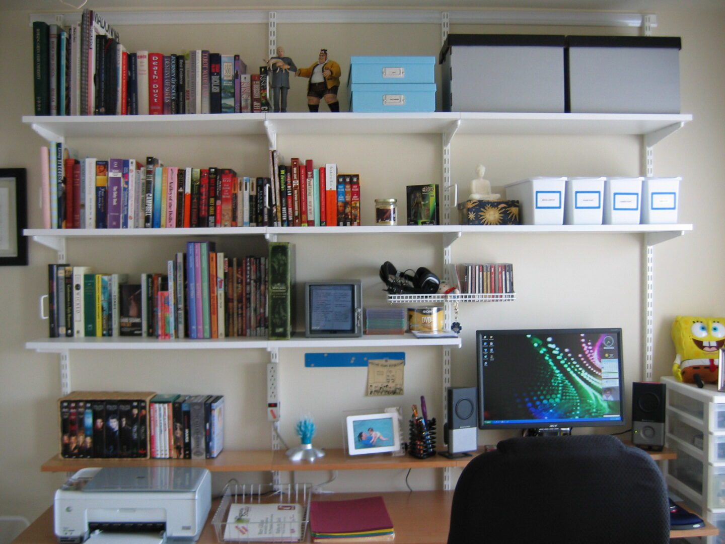 - Have a combination of open and closed storage system in your home office (i.e. a wall system with open shelving, some enclosed shelves, and some deep drawers.